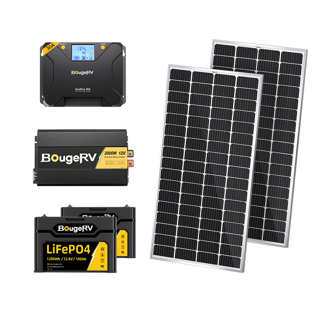BougeRV 12V 400W Rigid Solar Kit with 2×100Ah LiFePO4 Batteries, 2000W Inverter & 30A MPPT