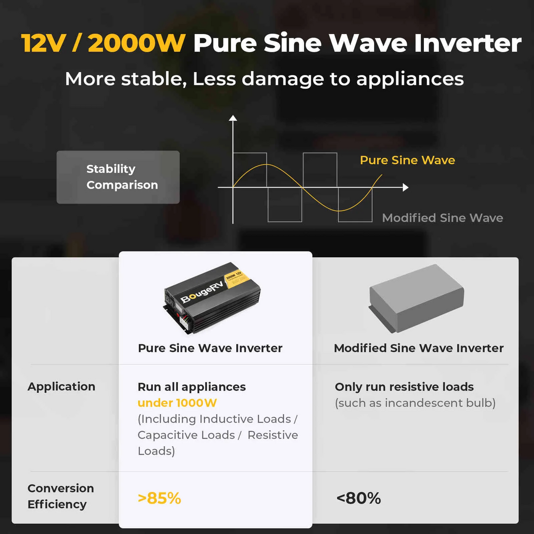 Pure Sine Wave Inverter: 2000W continuous | 4000W surge | 12V DC input | AC 120V ±10% output | 18-month warranty