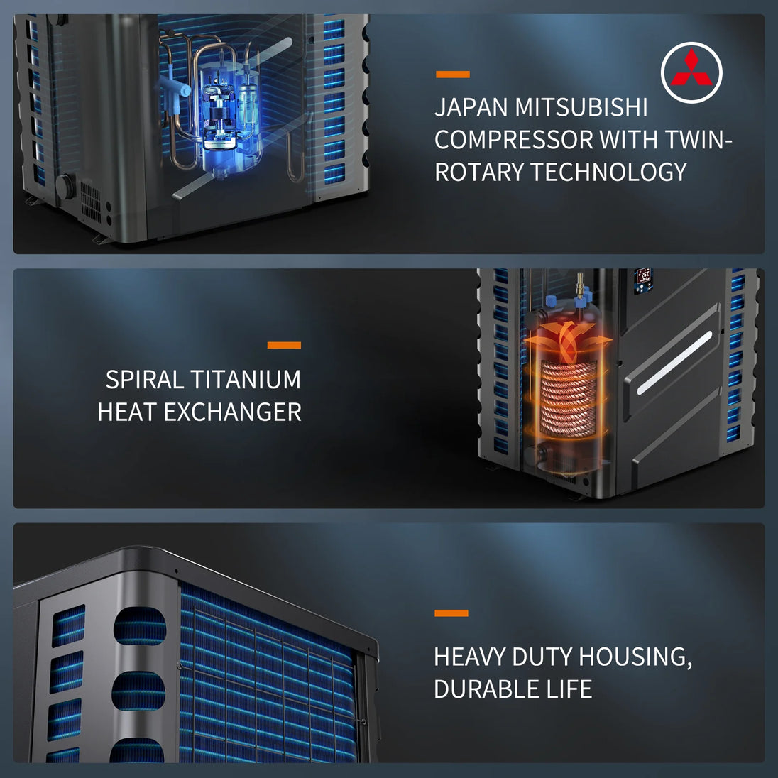 Twin Rotary Compressor – Balanced dual-rotor design minimizes vibration and enhances durability