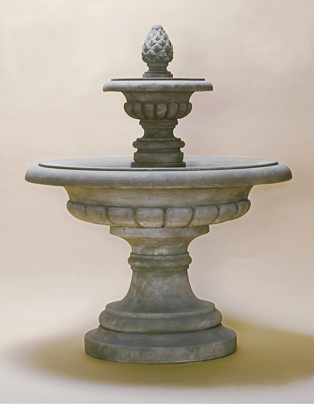 Make a grand statement in your outdoor space with the Fontana Grande Fountain by Giannini Garden. This striking two-tiered design features a prominent artichoke finial and classic bowl detailing, creating an elegant centerpiece for gardens, courtyards, or patios.