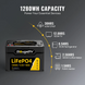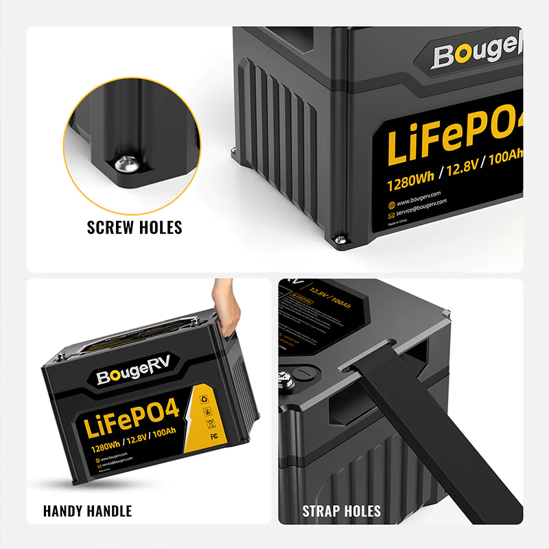 • LiFePO4 Batteries (2×100Ah): 1280Wh each | 4000+ cycles | 27 lbs each | Expandable up to 16 units | 12-year warranty