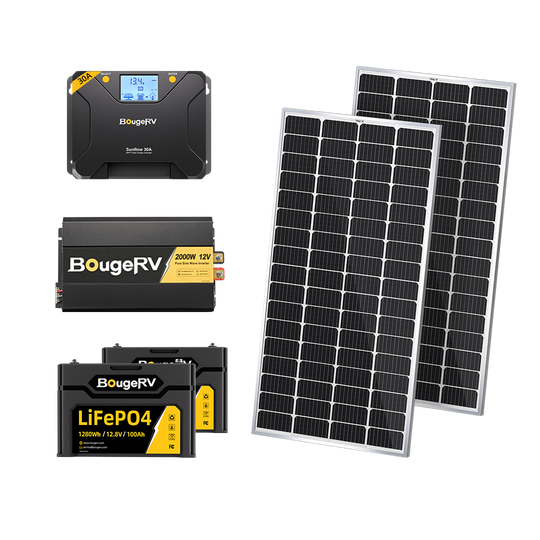 No reviewsThe BougeRV 12V 400W Rigid Solar Kit (Upgraded Version) is a complete off-grid power solution that combines high-efficiency 200W solar panels, dual 100Ah LiFePO4 batteries, a 2000W pure sine wave inverter, and a 30A MPPT solar...Sale price $1,619.99Regular price $1,899.00Sale price $1,619.99Regular price $1,899.00 -