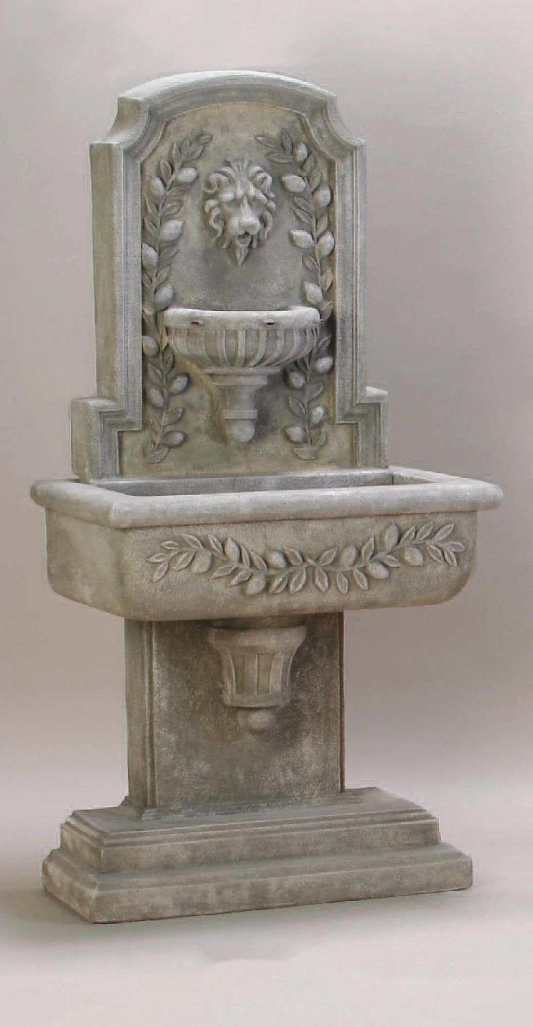 Bring classic European style to your courtyard or garden with the Sorrentine Wall Fountain by Giannini Garden. Featuring a detailed lion head spout and sculpted laurel accents, this self-contained design is perfect for placing against a wall to create an inviting focal point with the gentle sound of flowing water.
