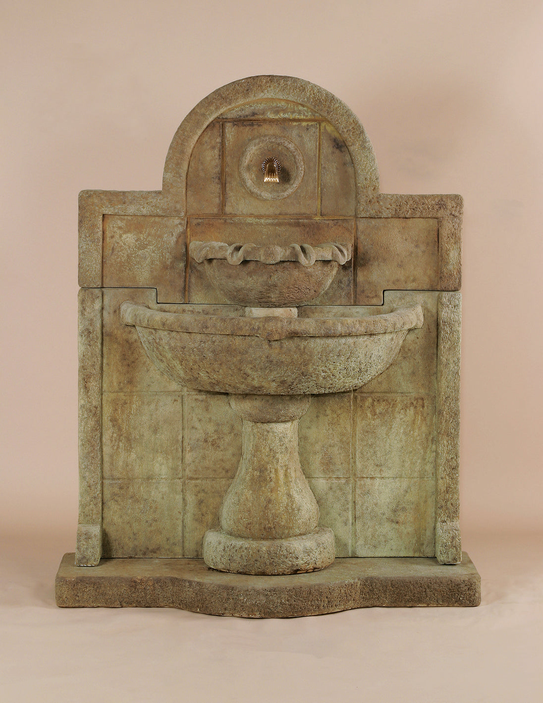 Bring the look of ancient Italian baths to your outdoor space with the Terme Del Foro Wall Fountain For Spout by Giannini Garden. This beautifully rustic design features a tall, arched back with classic block detailing, an upper bowl ready for a spout (sold separately), and a large, deeply curved lower basin supported by a sculpted pedestal. Handcrafted from durable cast stone, it evokes old-world masonry and the timeless appeal of historic European architecture—perfect for patios, courtyards, or garden walls.
