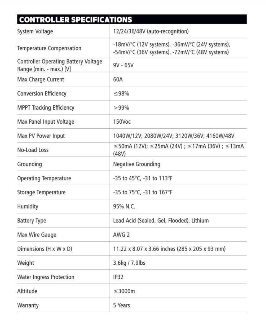 – Battery compatibility – Best paired with 400Ah AGM or 200Ah lithium battery banks.