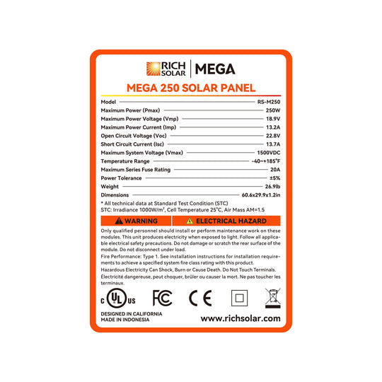 Rich Solar MEGA 250W 12V Monocrystalline Solar Panel – High-Efficiency TopCon N-Type, Off-Grid for RV, Van, Boat – 25-Year Warranty