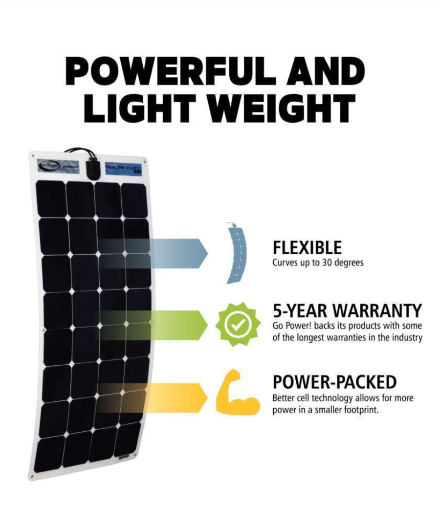 The Go Power Flex 550W Flexible Solar Kit is the largest flexible panel kit from Go Power!, designed for RVs, boats, and lightweight off-grid applications. Delivering 550 watts of solar charging power paired with a 60A MPPT Pro Solar Controller, this kit is perfect for high-demand battery charging while maintaining a lightweight and low-profile installation.
