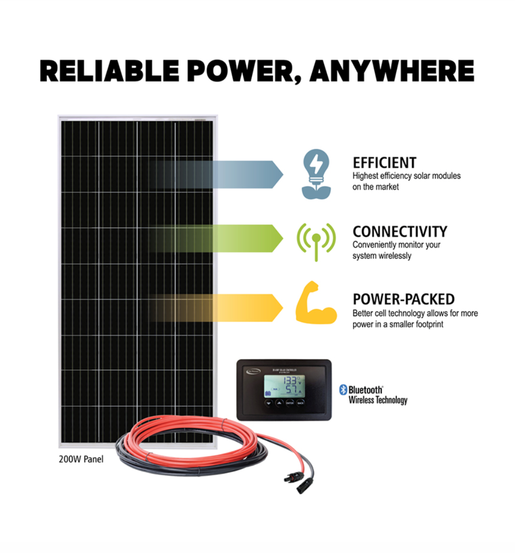 – Smart solar controller – 30A Bluetooth® PWM controller enables mobile system monitoring for convenience and efficiency.