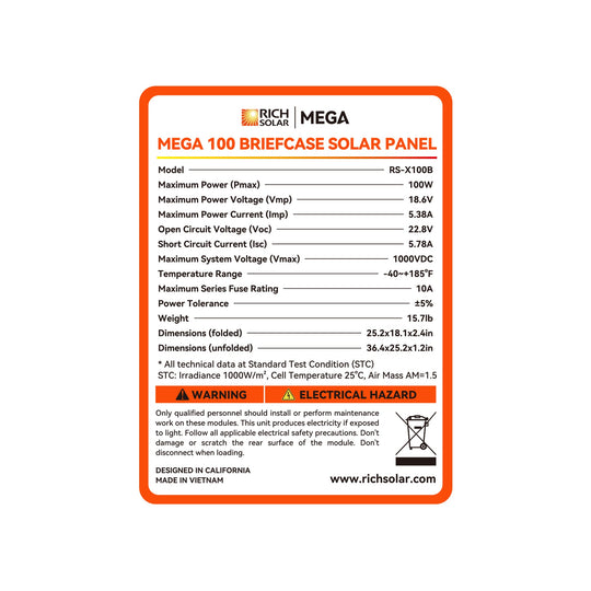 Rich Solar MEGA 100 Portable Briefcase Solar Panel – 100W, 12V, Monocrystalline, Waterproof, For Generators, Power Stations, Vans