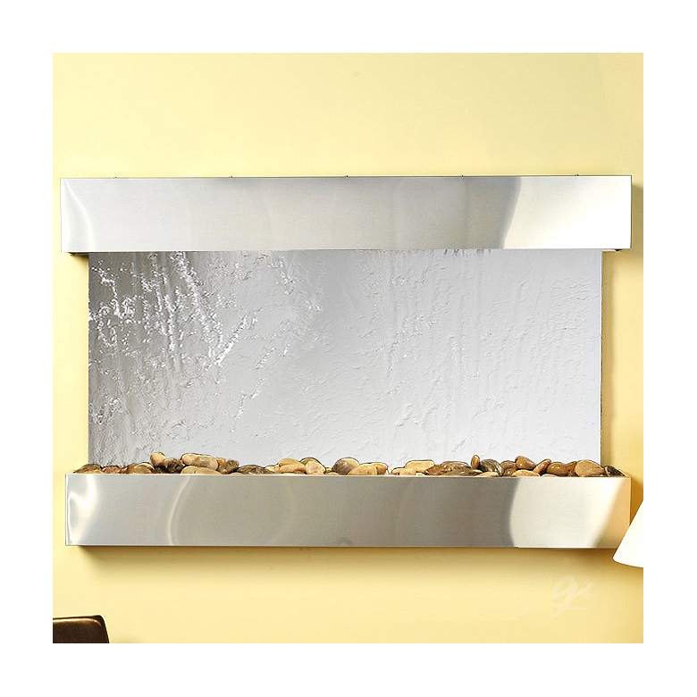 Bring calm, modern luxury to any interior with the Adagio Sunrise Springs Mirrored Indoor Wall Fountain. A polished stainless-steel hood and tray frame a luminous silver-mirror cascade panel that reflects light and movement to expand any room visually while adding the relaxing sound of falling water.