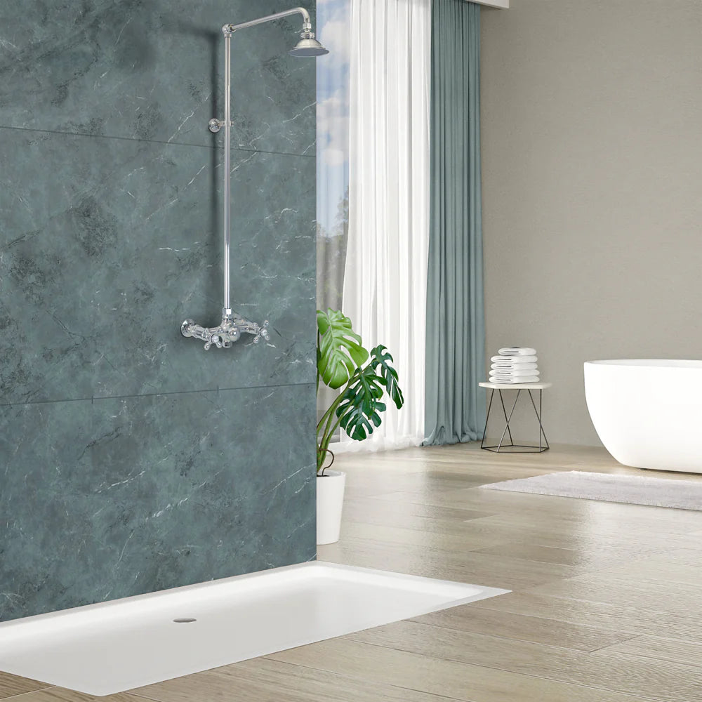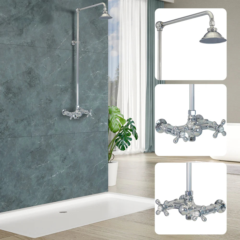 Upgrade your outdoor space with the Strom Living Outdoor Exposed Shower System - a perfect blend of classic design and everyday practicality. This wall-mounted unit features a generous 12" shower head and timeless cross handles, offering both style and reliable performance. Whether you're rinsing off mud, sand, or dirt after a day outside, this system keeps the mess outdoors while adding an elegant touch to your exterior. Designed for durability, it includes a removable faucet bottom cap for hassle-free winterization and maintenance.